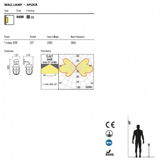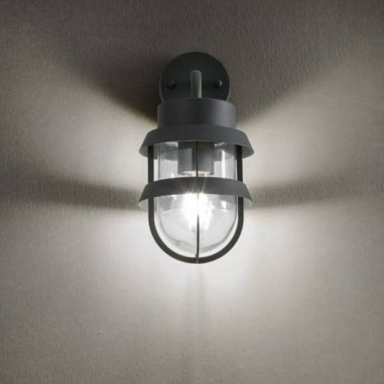 Aplică moderna pentru exterior, cu structura din aluminiu turnat sub presiune vopsit în câmp electrostatic culoare gri închis si dispersor din sticlă transparentă.