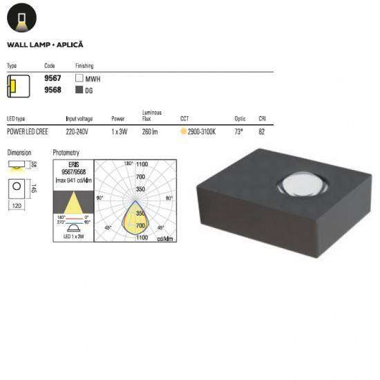 Echipată cu POWER LED 1X3W cu temperatura de culoare alb cad 3000K.