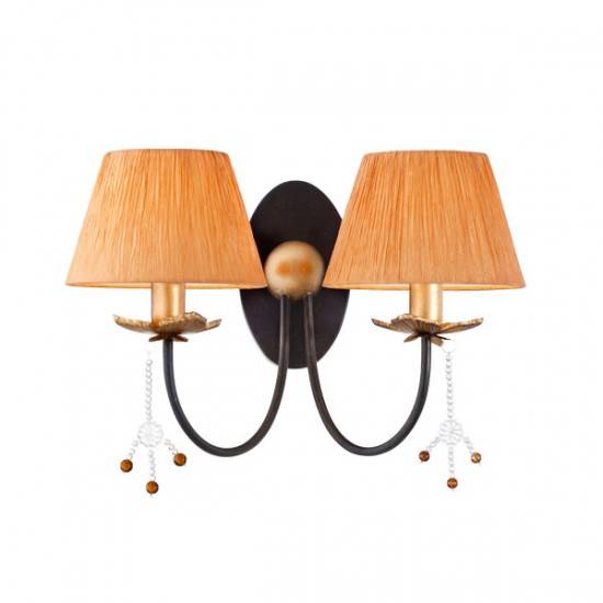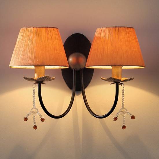 Aplică clasica pentru interior cu structură din metal vopsit maro cu patina aur, decoratiuni din sticlă transparentă si sticlă ambra si abajururi din tesătură grofată orange.