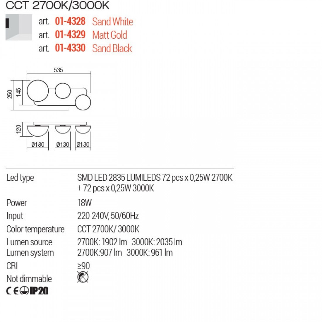 Echipata cu LED-uri SMD CCT 18W, cu posibilitatea de schimbare a temperaturii de culoare 2700K și 3000K.