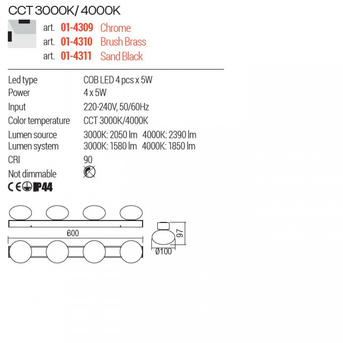Echipata cu LED CCT COB 4x5W, cu posibilitate de selectare a temperaturii de culoare a luminii alb cald 3000K sau alb neutru 4000K.