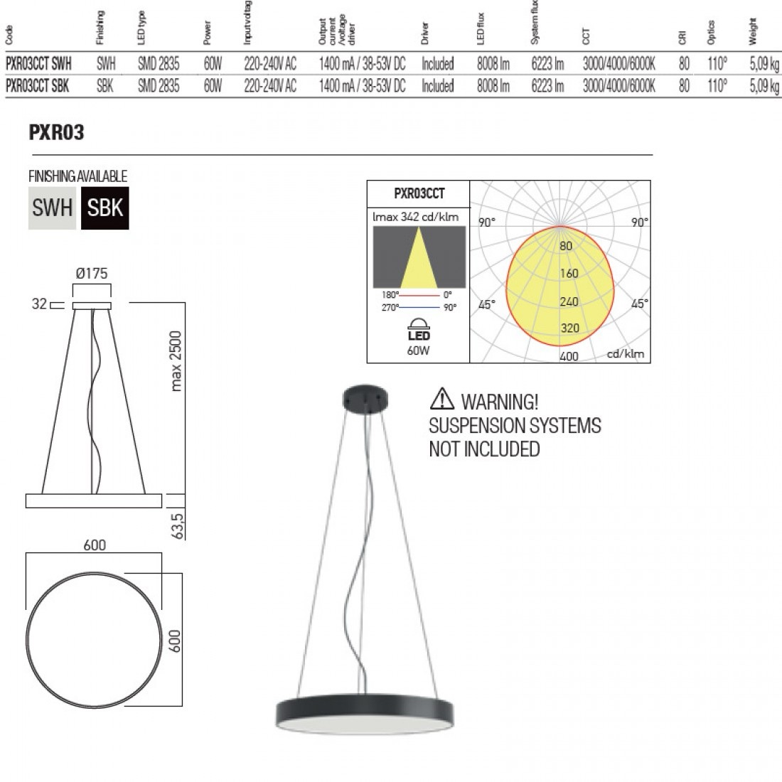 XPill Round, Corp de iluminat suspendat sau aplicat în tavan, negru , LED, 60W, 3000K-4000K-6000K, 60 cm, 8400Lm, PXRU03CCT SBK