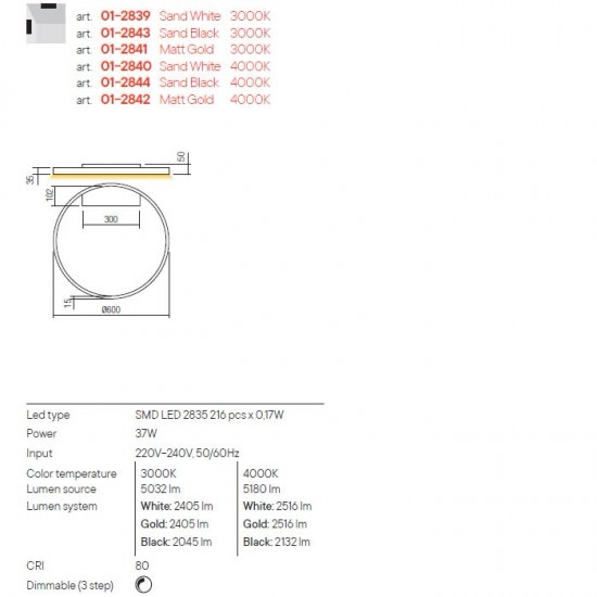 APLICA/PLAFONIERA REDO FEBE LED 37W 3000K D600 ALB MAT, 01-2839