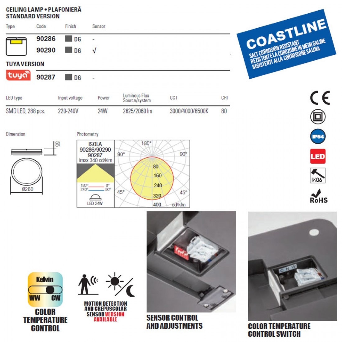 Plafoniera de exterior cu senzor ISOLA LED 24W IP54 Gri închis 3000K/6500K 90290