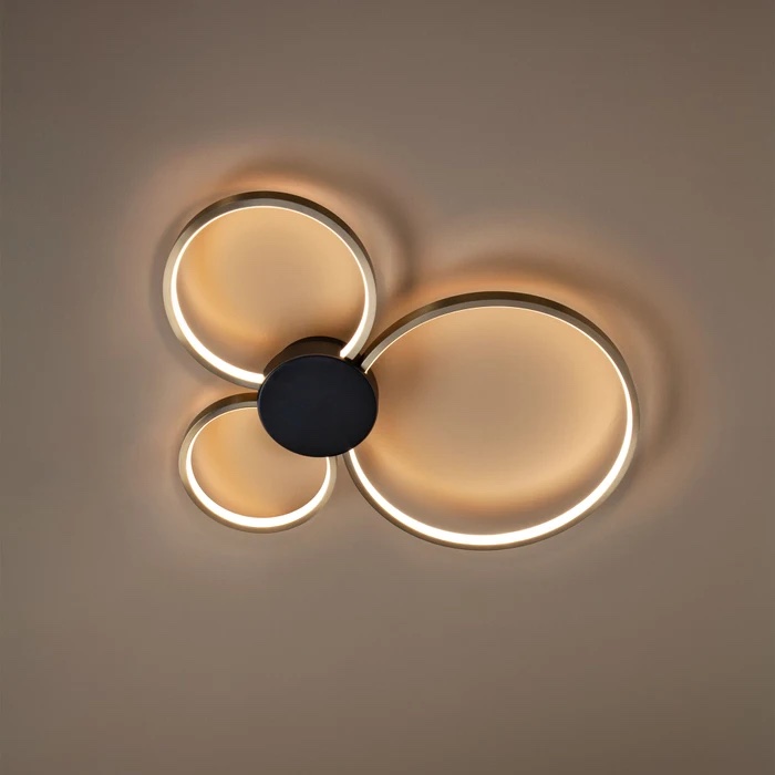 Lustra moderna pentru interior, cu structura din metal vopsita negru mat cu cercuri din aluminiu finisat alama si dispersoare din silicon alb.