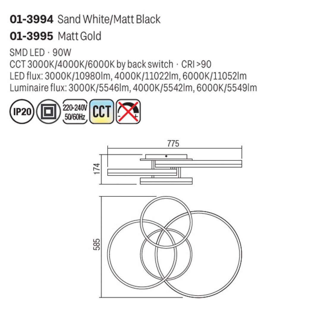Echipată cu LED-uri SMD CCT 90W, cu posibilitate de selectare a temperaturii de culoare a luminii alb cald 3000K, alb neutru 4000K sau alb rece 6000K.