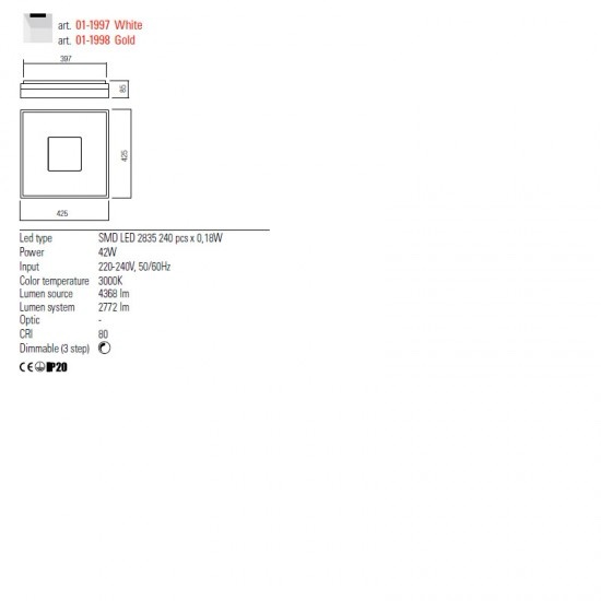MAYA PLAFONIERA REDO LED SQ 64W 3000K MAT GOLD, 430X430, 01-1998
