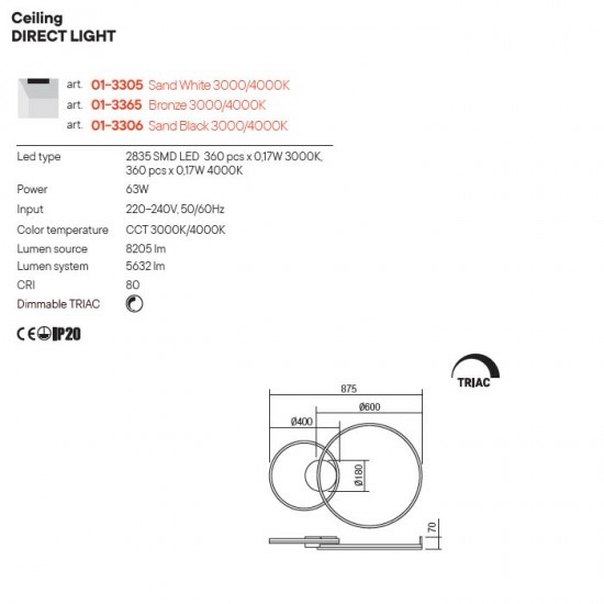 Lustră / Plafoniera Redo Orbit led 63W 3000K/4000K alba, dimabila TRIAC, 01-3305
