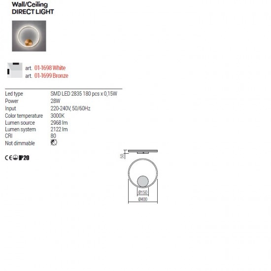 ORBIT APLICĂ/PLAFONIERA REDO LED 25W 4000K D400 BRONZ, DIMABILA TRIAC, 01-1699-TRIAC