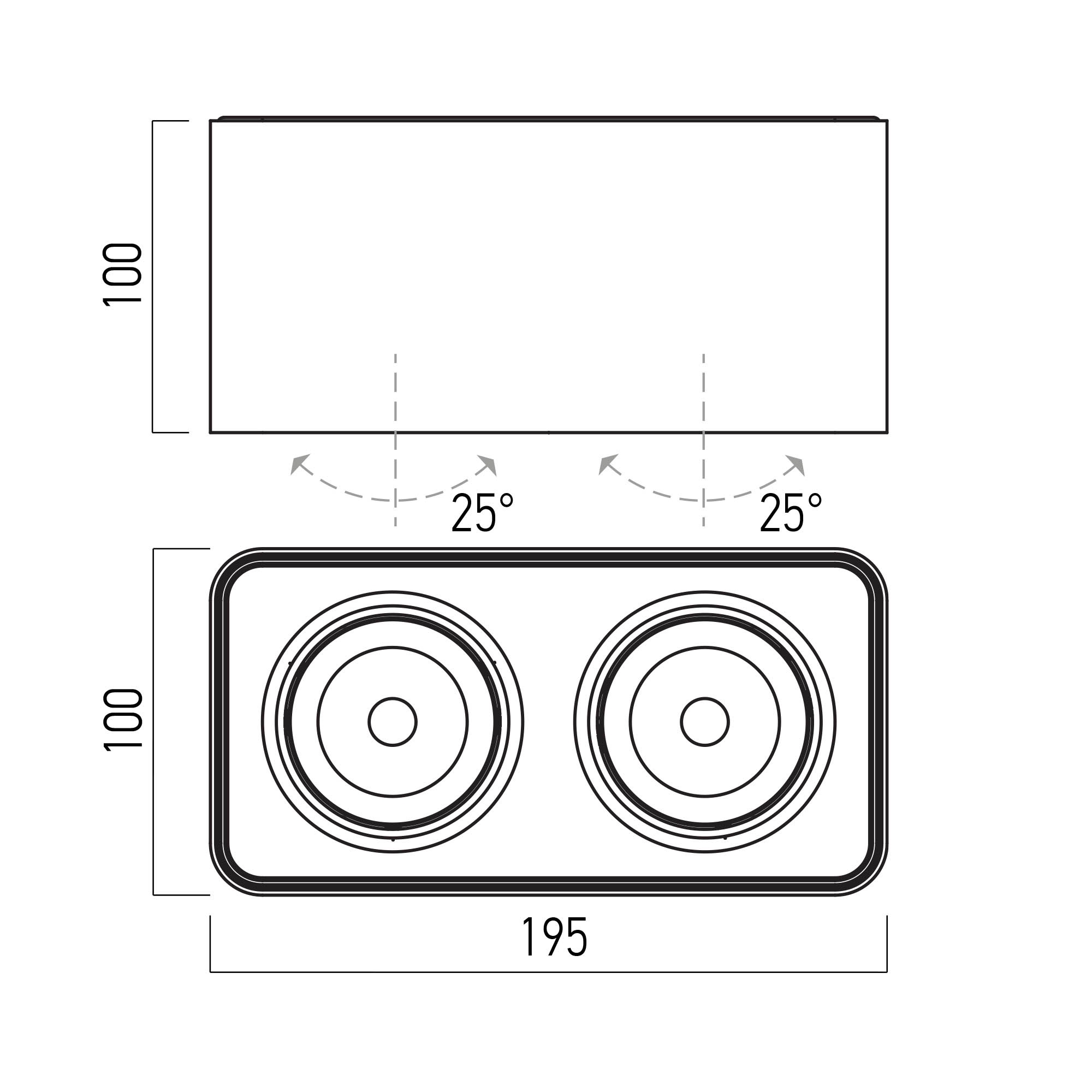 Structură din aluminiu turnat, vopsită în câmp electrostatic, culoare negru sablat. Partea frontală și suportul pentru LED din aluminiu vopsit alb sablat. Bază pentru montajul pe tavan din tablă de oțel ambutisată, vopsită alb.