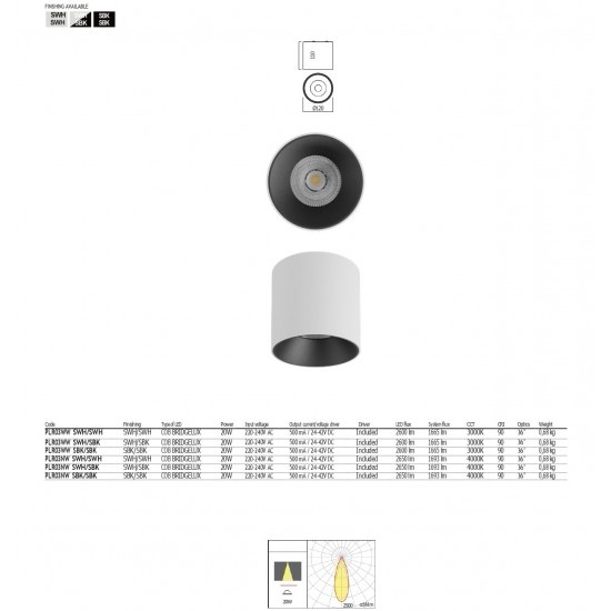 Plafoniera Arelux XPilar, aluminiu, alb, LED, 20W, 2600 lumeni, alb neutru 4000K, IP40, D.12cm, PLR03NW SWH/SWH