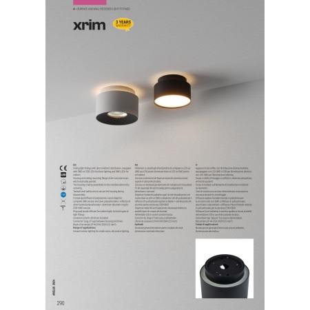 Carcasa și elementul de fixare pe tavan din aluminiu turnat, vopsită în câmp electrostatic, culoare albă cu finisaj sablat. Carcasa se montează pe elementul de instalare prin înșurubare. Inel decorativ din aluminiu vopsit în câmp electrostatic negru sablat. Fir de siguranță din oțel torsadat pentru asigurarea la demontare a carcasei.