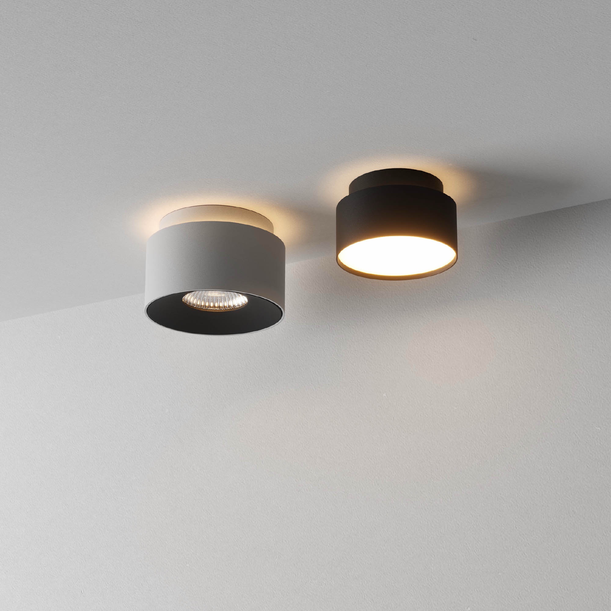 Carcasa și elementul de fixare pe tavan din aluminiu turnat, vopsită în câmp electrostatic, culoare albă cu finisaj sablat. Carcasa se montează pe elementul de instalare prin înșurubare. Inel decorativ din aluminiu vopsit în câmp electrostatic negru sablat. Fir de siguranță din oțel torsadat pentru asigurarea la demontare a carcasei.
