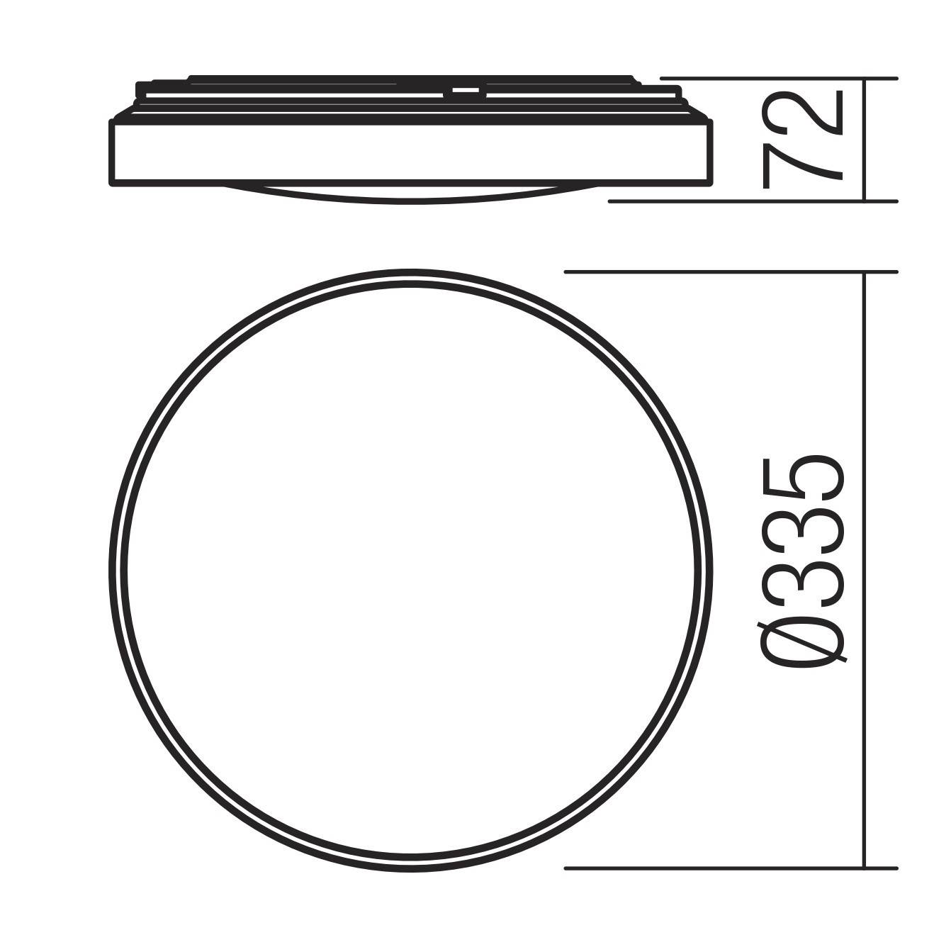 Corpul de iluminat are o inaltime de 77 mm si un diametru de 385 mm, iar gradul de protectie de IP44 asigura protectie impotriva factorilor de mediu (corpurilor solide si apa pulverizata).