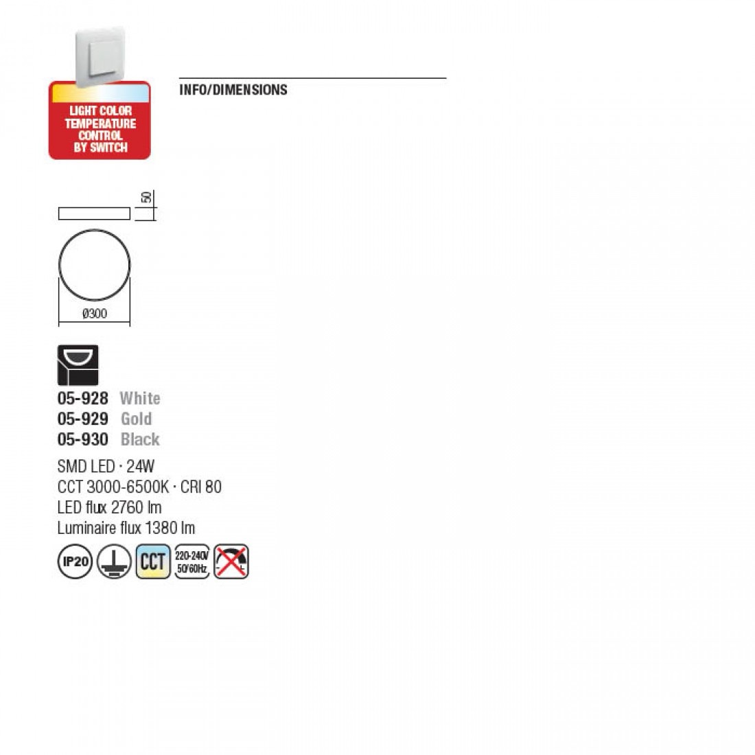 Echipata cu LED-uri SMD 24W alb cald și alb rece, permite setarea temperaturii de culoare a luminii de la alb cald la alb rece prin acționarea comutatorului.