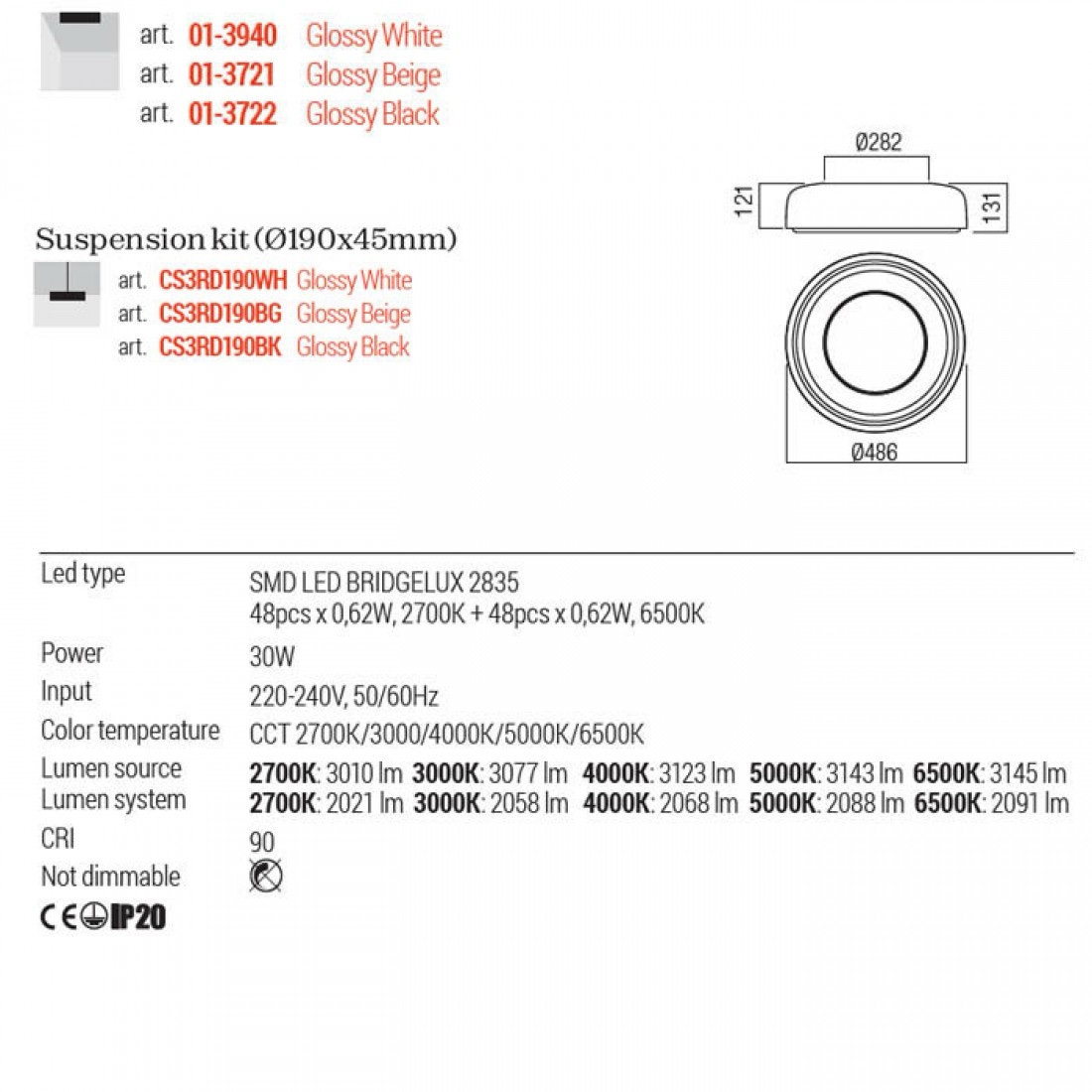 Echipată cu LED-uri SMD CCT 30W cu posibilitatea de a selecta temperatura de culoare a luminii de la 2700K, 3000K, 4000K, 5000K sau 6500K.