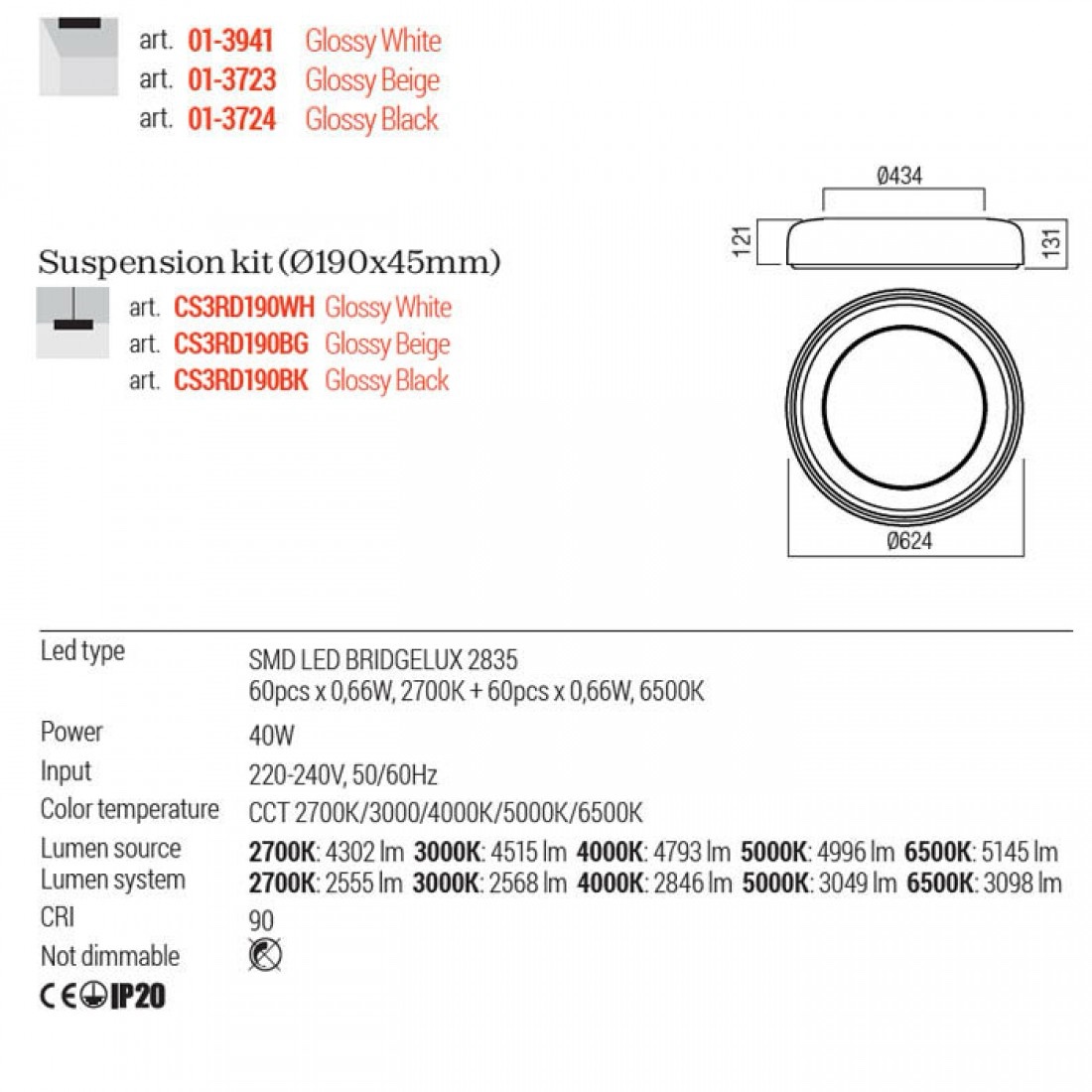 Echipată cu LED-uri SMD CCT 40W cu posibilitatea de a selecta temperatura de culoare a luminii de la 2700K, 3000K, 4000K, 5000K sau 6500K.
