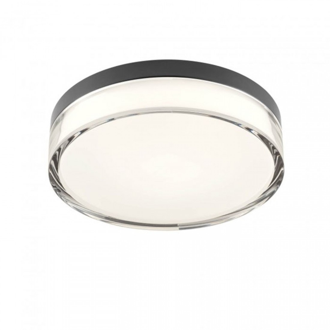 Plafonieră pentru interior, cu grad de protectie la umiditate, cu structură din aluminiu vopsit negru mat si dispersor din PMMA vopsit alb la interior și transparent la exterior.