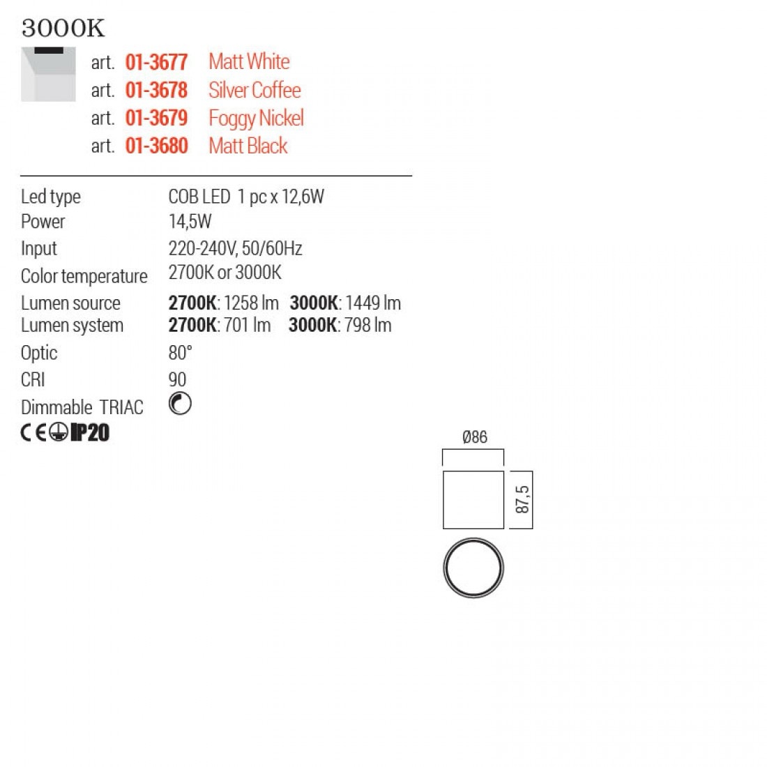 Plafonieră pentru interior echipată cu LED COB, structură din aluminiu extrudat, vopsită nickel mat, dispersor din policarbonat alb opal.