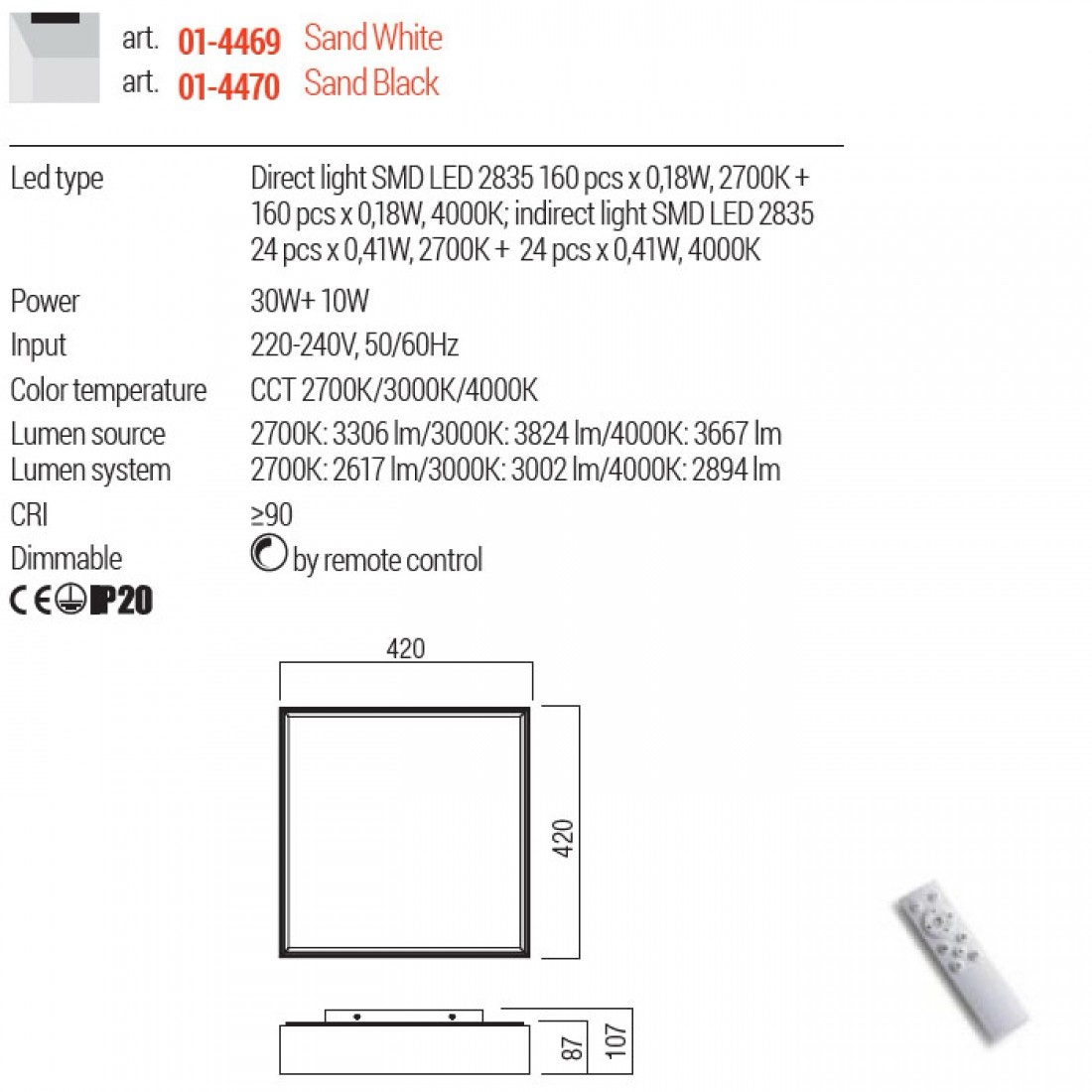 Echipata cu LED-uri SMD CCT 30W+10W cu temperatura de culoare alb cald 2700K, alb cald 3000K sau alb neutru 4000K.