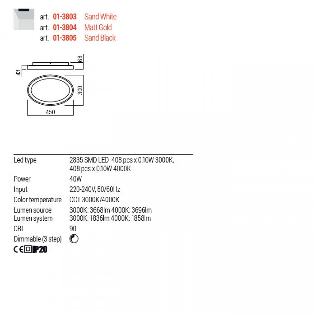 Echipată cu LED-uri SMD CCT 40W cu temperatura de culoare reglabila 3000K/4000K.