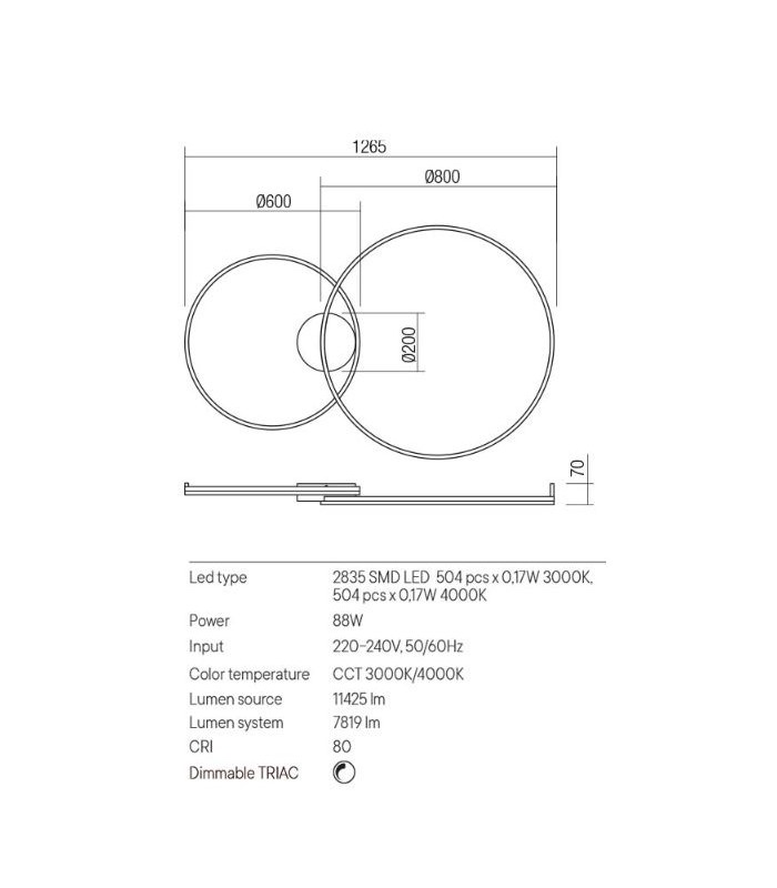 Echipată cu LED-uri SMD CCT 88W cu temepratura de culoare alb cald 3000K sau alb neutru 4000K.