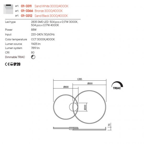 Echipată cu LED-uri SMD CCT 88W cu temepratura de culoare alb cald 3000K sau alb neutru 4000K.