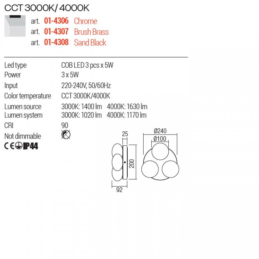 Echipata cu LED CCT COB 3x5W, cu posibilitate de selectare a temperaturii de culoare a luminii alb cald 3000K sau alb neutru 4000K.