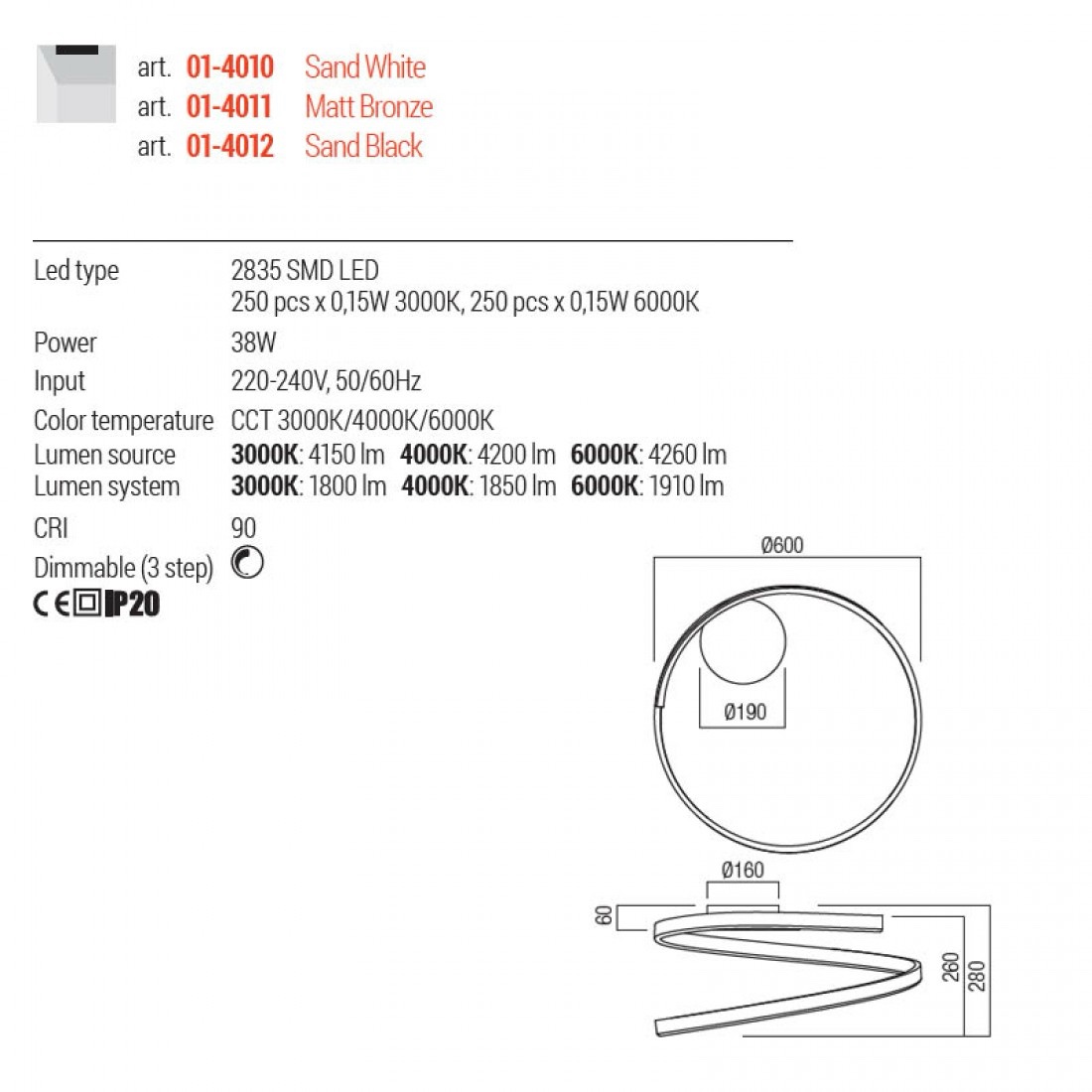 Echipată cu LED-uri SMD CCT 38W cu temperatura de culoare reglabila 3000K/4000K/6000K.