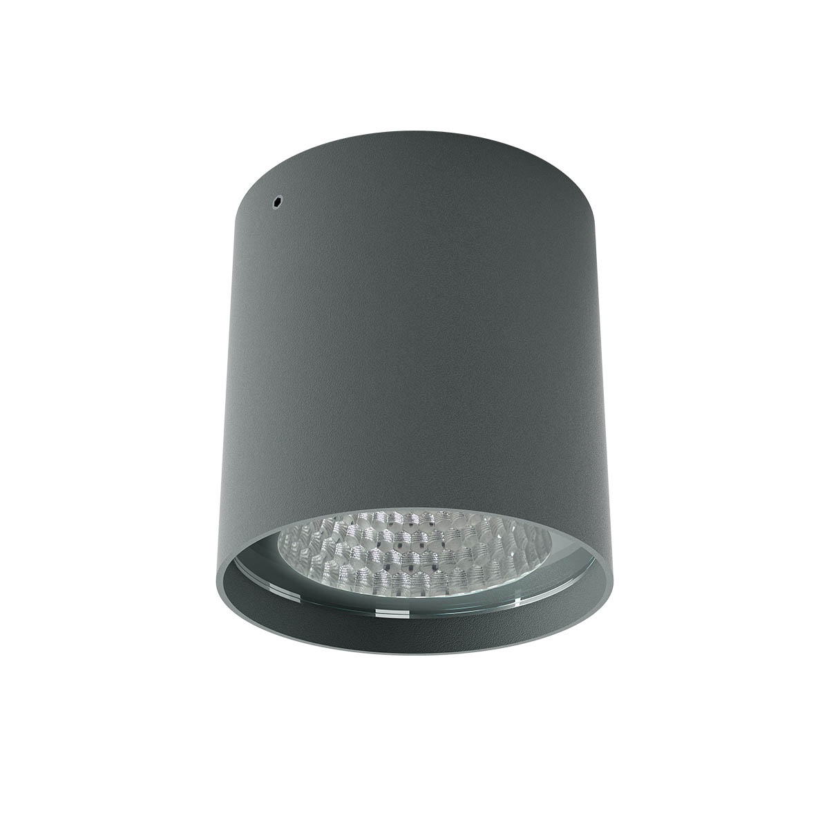 Plafonieră pentru exterior echipată cu LED COB și driver on board. Corp din aluminiu turnat sub presiune, cu tratament de protecție antirugină și anticoroziune prin cataforeză, vopsit în câmp electrostatic gri închis, reflector fațetat din aluminu, dispersor din sticlă temperată transparentă.