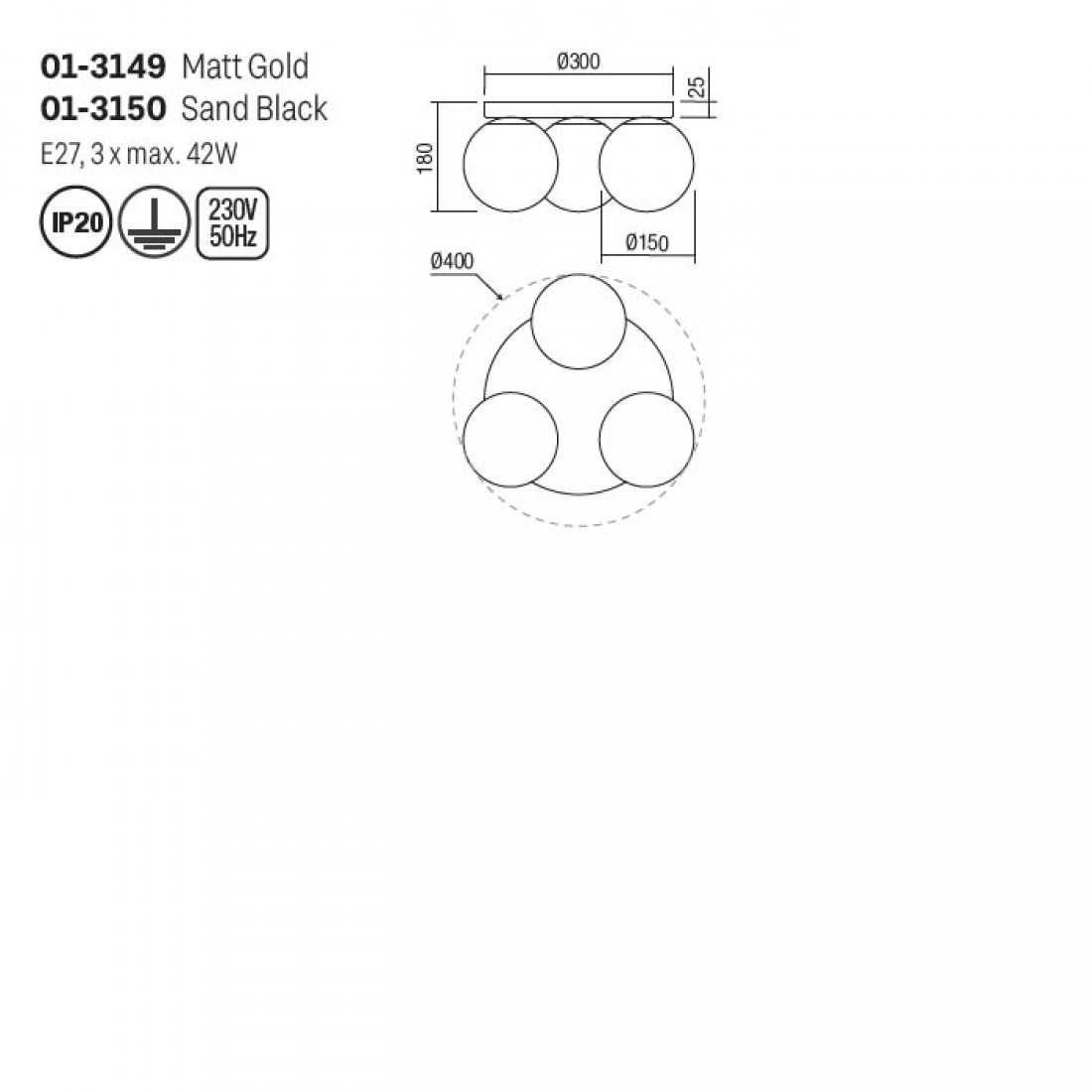 Plafoniera Smarter Bowling, aur mat, sticla, 3XE27, D.40 cm, 01-3149