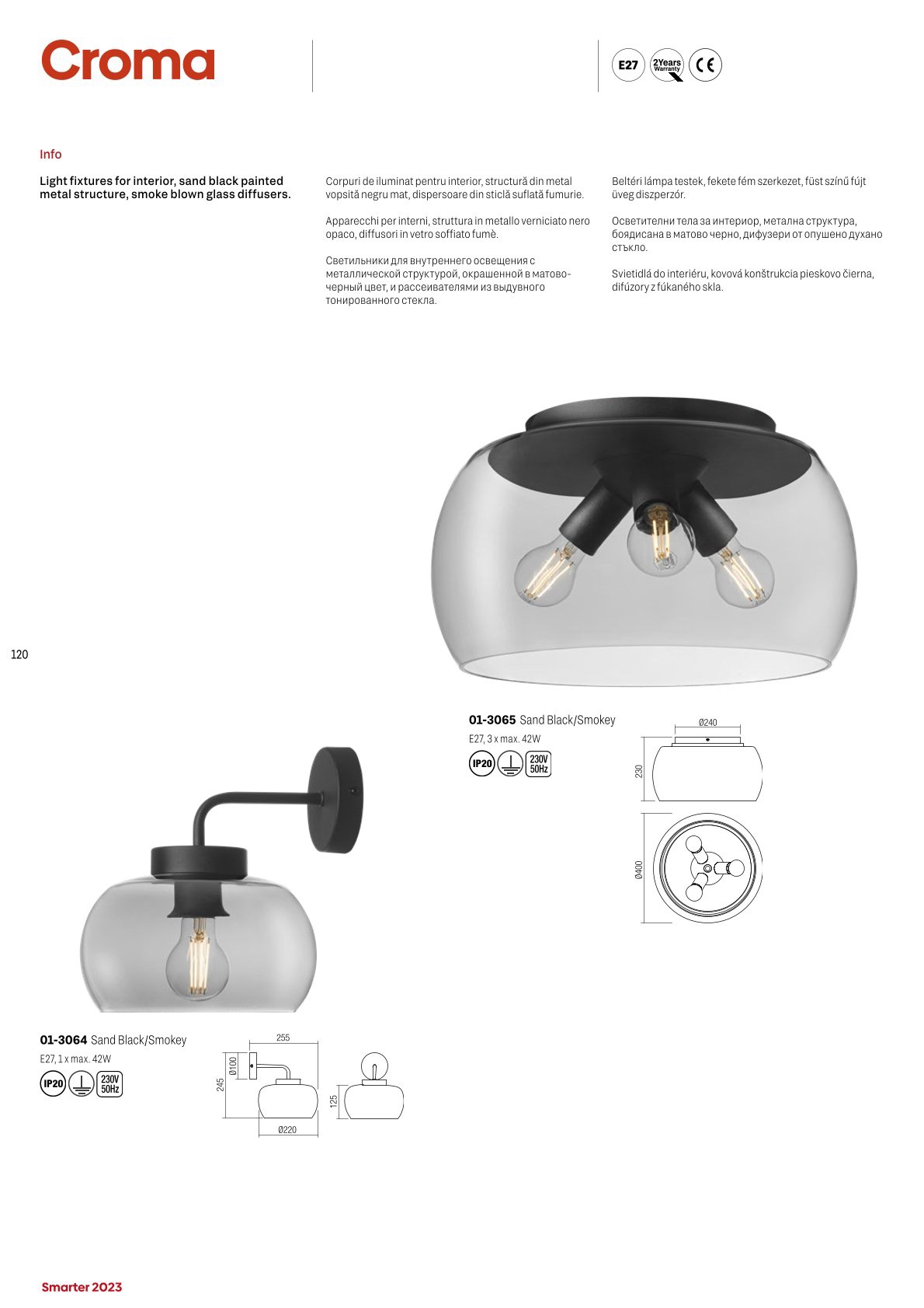 Plafoniera Smarter Croma, negru mat, sticla fumurie, 3XE27, 01-3065