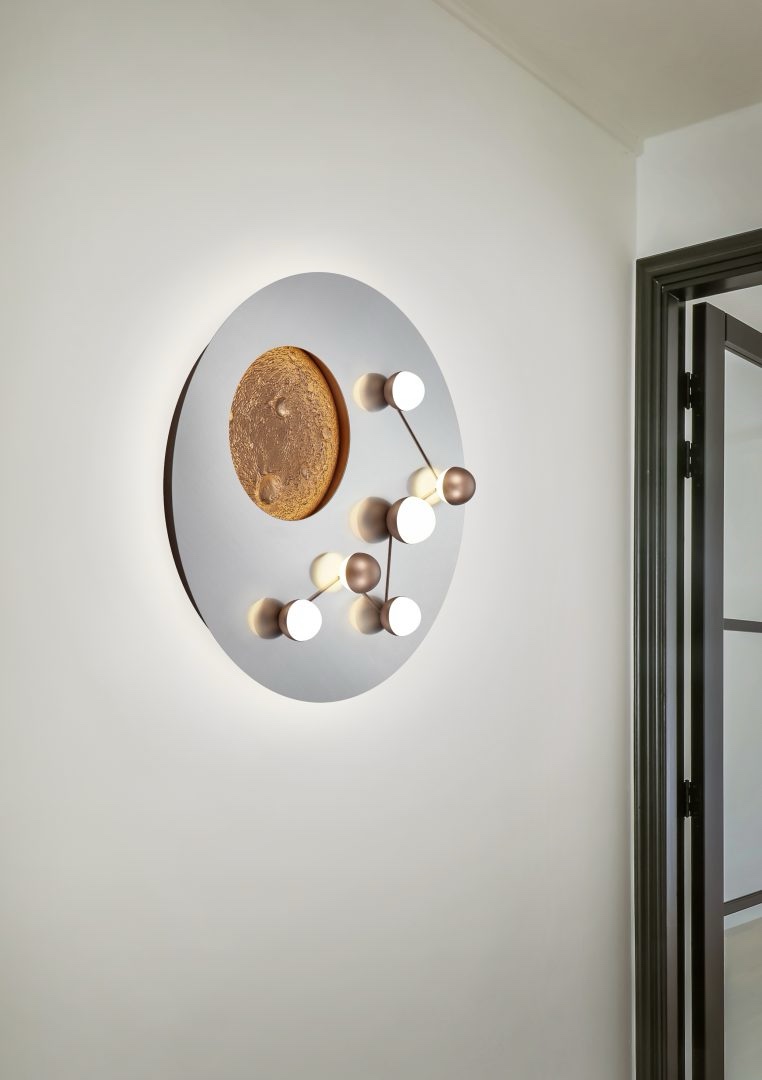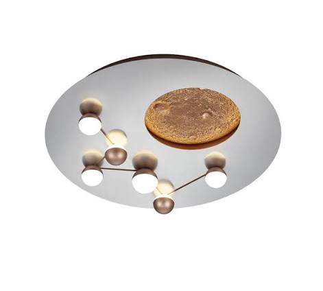 Plafoniera moderna pentru interior, cu structura din metal finisaj aluminiu periat si detalii maro satinate, dispersoare din acril alb opal cu lumina directa si indirecta.