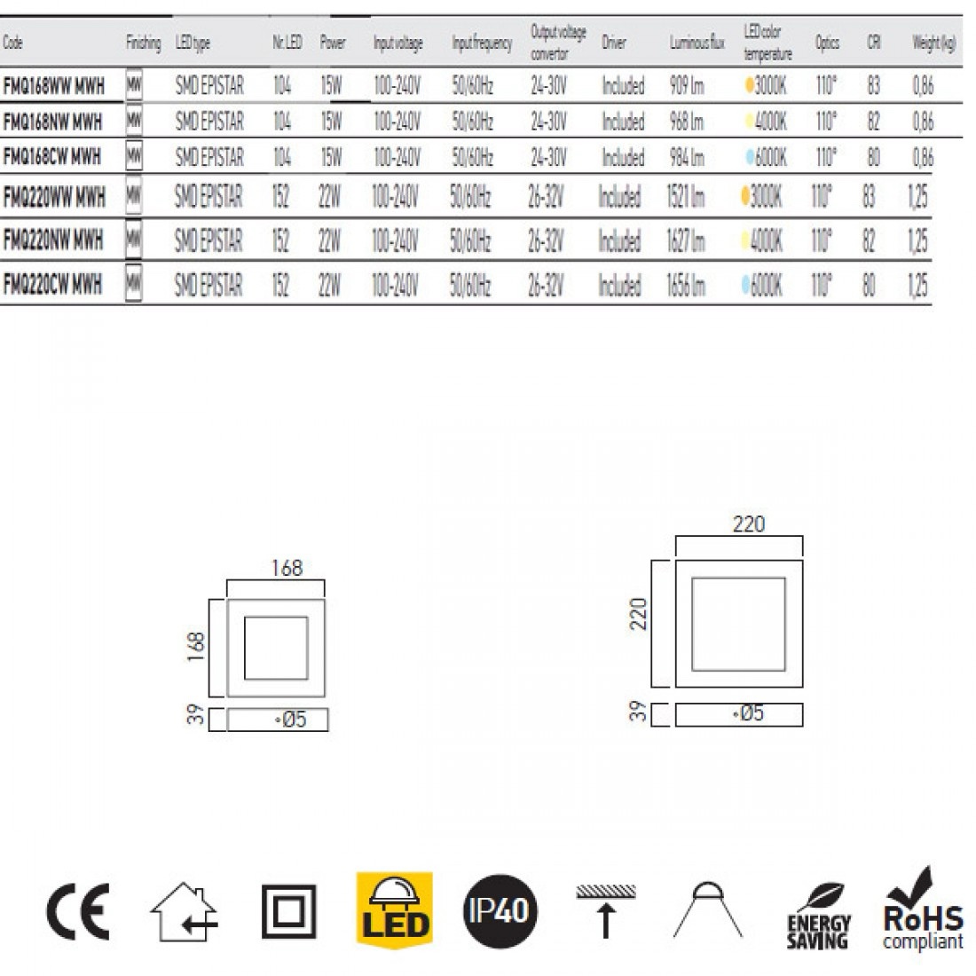 Corp din aluminu turnat sub presiune, vopsit în câmp electrostatic, culoare alb mat. Bridă de fixare din tablă de oțel zincat.