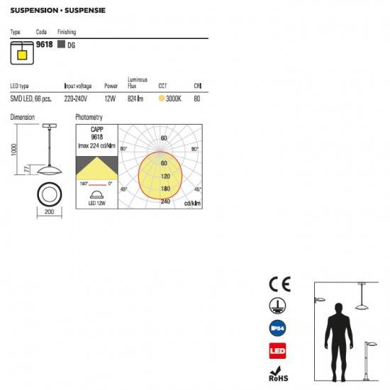 Suspensie modernă pentru exterior, cu structura din aluminiu turnat sub presiune vopsit în câmp electrostatic gri închis si dispersor din policarbonat opal.