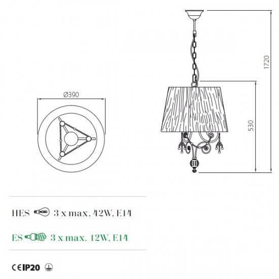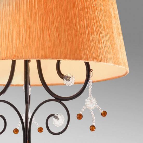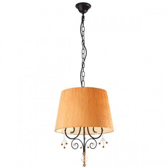 Suspensie clasica pentru interior cu structură din metal vopsit maro cu patina aur, decoratiuni din sticlă transparentă si sticlă ambra si abajur din tesătură grofată orange.