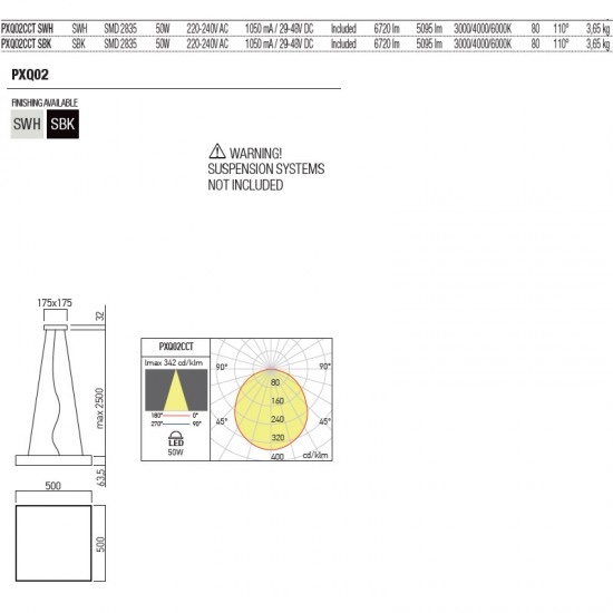 Xpill Square Corp de iluminat suspendat sau aparent, alb, LED, 50W, 3000K-4000K-6000K, 50 cm, 7000Lm, PXQU02CCT SWH